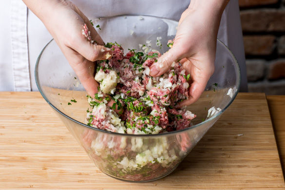 Die Semmelbrösel mit ca. 30ml Wasser einweichen. Inzwischen die Petersilie fein hacken. Ein Ei verquirlen und die Hälfte vom Ei mit Rinderhack, Petersilie, Zwiebelwürfel und den aufgeweichten Semmelbröseln zu einer gleichmäßigen Masse verkneten. Die Füllung mit Salz, Pfeffer und nach Geschmack mit Muskat abschmecken.