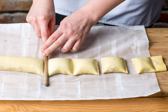 Zuerst den freien oberen Rand mit dem restlichen Ei betreichen. Dann den unteren Rand ca. 1cm breit einklappen und den Teig locker zu einer 2-3cm dicken Schnecke aufrollen. Die Schnecke nochmal mit Wasser bestreichen und mit dem Stiel eines Kochlöffels vorsichtig ca. 2-3cm lange Taschen abdrücken. Diese mit einem Messer voneinander trennen.