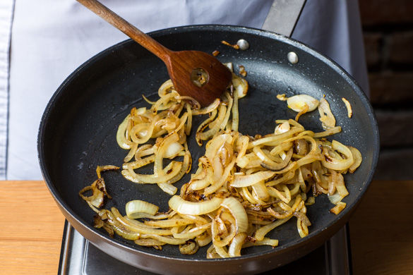 Inzwischen die Zwiebelstreifen mit 1-2EL Pflanzenöl in einer kleinen Pfanne auf niedriger Hitze für ca. 5-6Min. goldgelb anbraten. Schnittlauch in feine Röllchen schneiden. Die Maultaschen mit etwas Brühe, den gebratenen Zwiebeln und Schnittlauch garniert servieren.