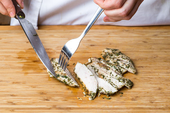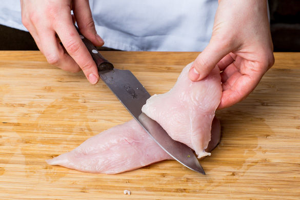 Die Hähnchenbrust in der Mitte halbieren, sodass zwei dünne Scheiben entstehen.