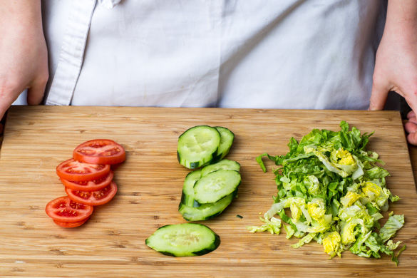 Den Strunk des Romanasalats entfernen, den Salat halbieren und in feine Streifen schneiden. Die Gurke nach Wunsch schälen und in ca. 0,5cm dicke Scheiben schneiden. Die Tomate ebenfalls in ca. 0,5cm dicke Scheiben schneiden.
