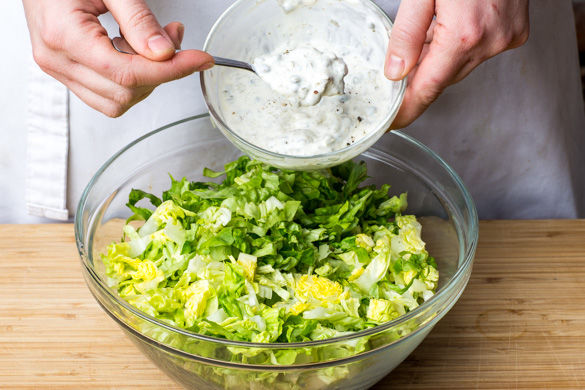 Von den Kapern etwas Flüssigkeit aufbewahren, die Kapern dann in einem Sieb abspülen und abtropfen lassen. Die Kapern fein hacken und mit der Mayonnaise mischen, mit etwas Kapernsaft, Salz und Pfeffer abschmecken. Den Romanasalat mit der Sauce mischen und ggf. noch einmal abschmecken.
