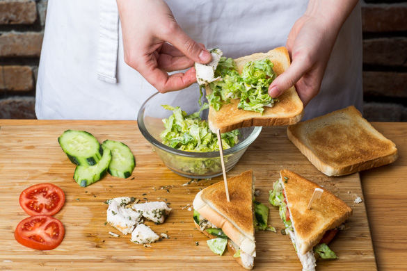 Währenddessen die Sandwichscheiben in einer weiteren Pfanne oder einem Toaster rösten. Nun 3 mal 2 Scheiben nach Wunsch mit Hähnchen, Romanasalat, Gurke und Tomate belegen, mit den Spießen fixieren und diagonal in Dreiecke halbieren. Restlichen Salat mit übrigen Gurken und Tomaten mischen und mit den Tramezzini servieren.