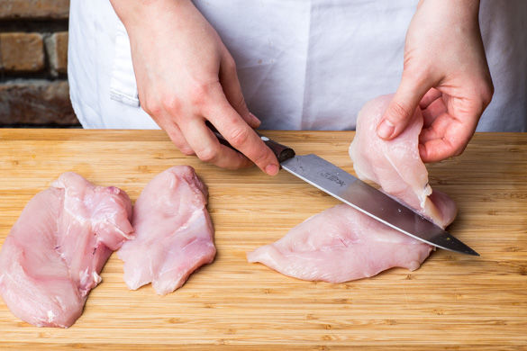 Die Hähnchenbrust in der Mitte halbieren, sodass je zwei dünne Scheiben entstehen.