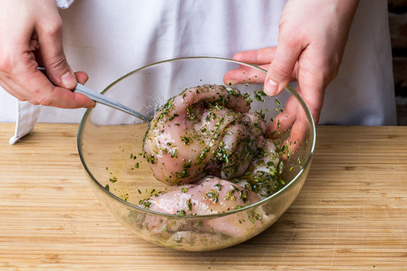 Die Rosmarinnadeln von den Stängeln streifen, fein hacken und mit 1–2EL Olivenöl vermischen. Die Hähnchenscheiben mit dem Rosmarinöl vermischen, das Fleisch von beiden Seiten mit Salz und Pfeffer würzen und bis zur weiteren Verwendung beiseitestellen.