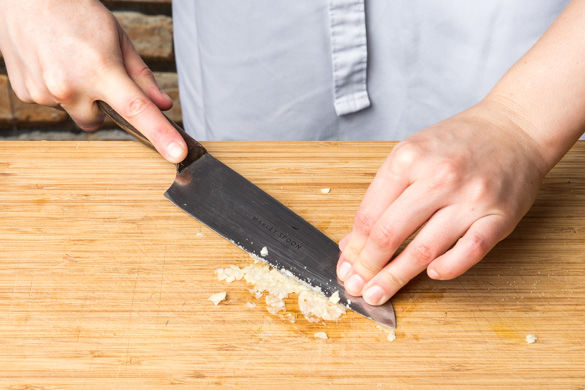 Den Knoblauch schälen und entweder mit einer Knoblauchpresse oder mit etwas Salz und dem Messerrücken auf einem Brett zu einer feinen Paste zerreiben.