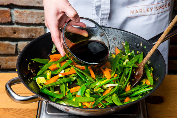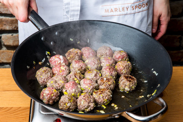 Fein abgestimmt mit der chinesischen Gewürzmischung aus Malabar Pfeffer, Anis, Chiliflocken und vielen anderen Gewürznoten ist dieses Gericht alles andere als fade! Die saftigen Hackfrikadellen werden mit Kaiserschoten, Karotten und Porree in salziger Sojasauce knackig angebraten und mit Udon-Nudeln serviert. Fertig ist die aromatische Reise in das Reich der Mitte!