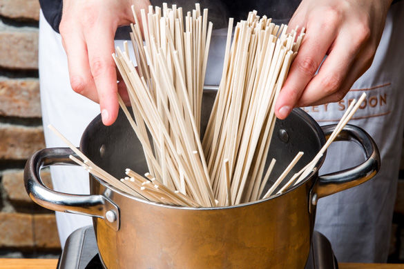 Sobald das Wasser kocht, die Udon-Nudeln ca. 8-10Min. kochen, bis sie bissfest sind. Dann abschütten, kalt abschrecken und warm halten.