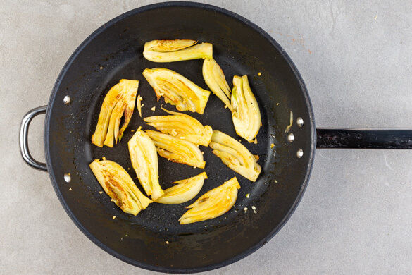 Den Fenchel in der Pfanne mit 2EL Olivenöl, 1/2TL Paprikapulver und 1 kräftigen Prise Salz bei mittlerer bis starker Hitze ca. 10Min. anbraten, dabei regelmäßig wenden, damit der Fenchel gleichmäßig bräunt. Den restlichen Knoblauch während der letzten 1–2Min. mitbraten.