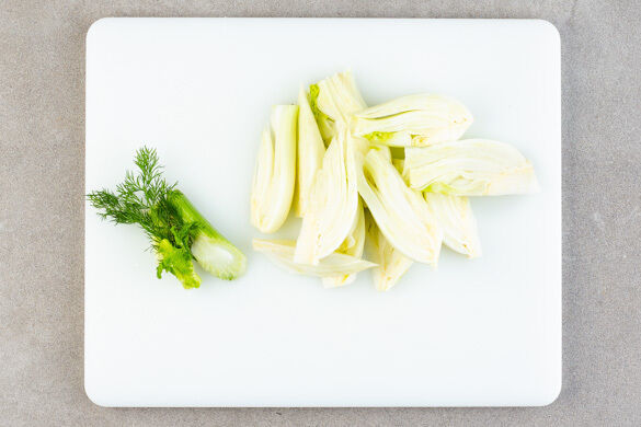 In einem mittelgroßen Topf ca. 1,2L Wasser für die Quinoa zum Kochen bringen. Die Stiele und das Fenchelgrün abschneiden und den Fenchel der Länge nach in dünne Spalten Schneiden. Das Fenchelgrün für die Garnitur aufbewahren.