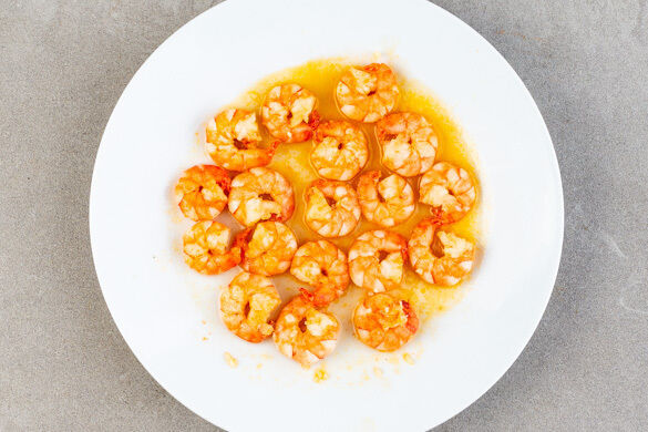 Die Garnelen im Sieb kalt abspülen und abtropfen lassen, dann trocken tupfen. In einer großen Pfanne mit 2EL Olivenöl, der 1/2 des Knoblauchs, 1/2–1TL Paprikapulver und 1/2TL Salz 3–4Min. anbraten. Auf einem Teller beiseitstellen. Die Pfanne kurz abspülen und abtrocknen.