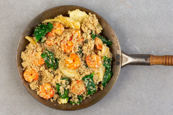 Auch ohne Balkon oder Garten werden wir Euch heute mit kulinarischen Sonnenstunden versorgen: Unsere spanisch angehauchte Quinoapfanne vereint rassige geräucherte Paprika mit der Würze von gebratenem Fenchel und der Frische von Zitronensaft. Dazu feiner Babyspinat, da möchte man doch glatt selbst Garnele sein!