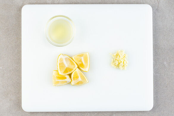 1 Zitrone halbieren und in Spalten schneiden, die übrige Zitrone halbieren und auspressen. Den Knoblauch schälen und fein würfeln.