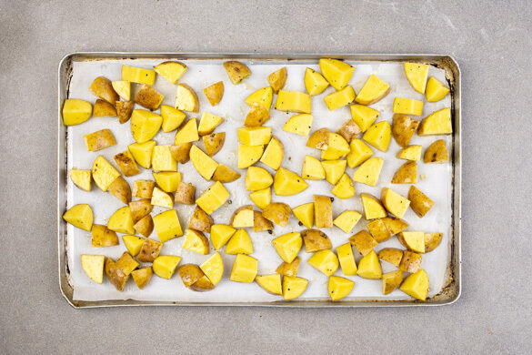 Den Backofen auf 240°C (220°C Umluft) vorheizen. Die Kartoffeln samt Schale würfeln und auf einem mit Backpapier ausgelegten Backblech mit 1EL Olivenöl und 1 kräftigen Prise Salz vermengen. Im Ofen in 20–25Min. goldbraun backen, nach der Hälfte der Zeit wenden.