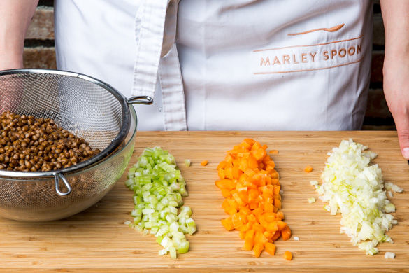 Inzwischen den Ofen auf 220°C Umluft oder auf 230°C Ober- und Unterhitze vorheizen. Die Zwiebeln schälen, halbieren und in feine Würfel schneiden. Die Linsen abtropfen lassen. Die Karotten schälen, der Länge nach vierteln und in feine Würfel schneiden, den Sellerie ebenso klein schneiden. Die Petersilie mit Stängel hacken.