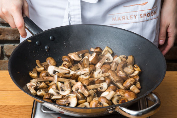 Inzwischen die Pilze mit etwas Küchenkrepp oder einer Bürste von evtl. Schmutz befreien und je nach Größe vierteln oder achteln. Anschließend mit 1EL Olivenöl in einer mittelgroßen Pfanne für ca. 3-4Min. auf hoher Hitze scharf anbraten.