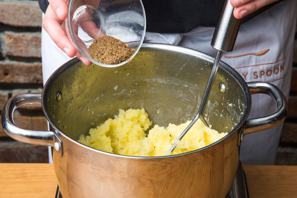 Sobald die Kartoffeln gar sind, 3/4 der Butter hinzufügen und zu einem feinen Püree stampfen, mit dem German Allrounder-Gewürz abschmecken. Ggfs. etwas Wasser oder, falls vorhanden, Milch hinzufügen, um das Püree noch cremiger zu machen.