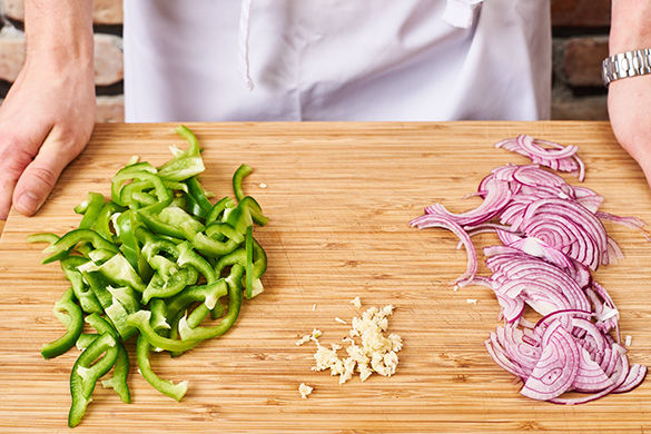 Die Zwiebeln schälen, halbieren und in Streifen schneiden. Knoblauch pellen und fein hacken. Die Paprika vierteln, vom Kerngehäuse befreien und ebenfalls in dünne Streifen schneiden. Backofen auf 180°C Ober/Unterhitze erhitzen.