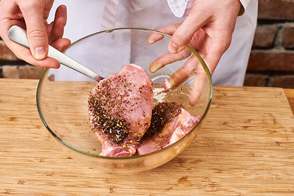 Den Szechuanpfeffer grob im Mörser oder in einer Tüte mit der Unterseite einer schweren Pfanne zerstoßen und das Fleisch dann damit sowie 1EL Pflanzenöl marinieren.
