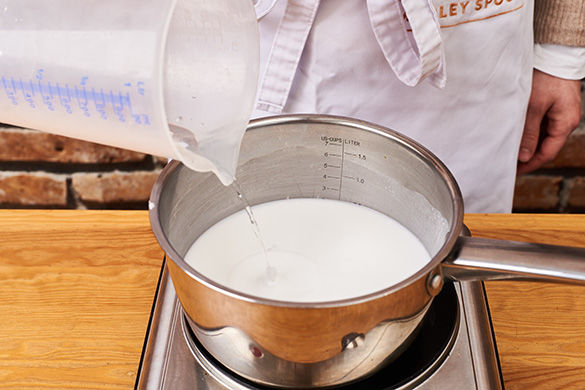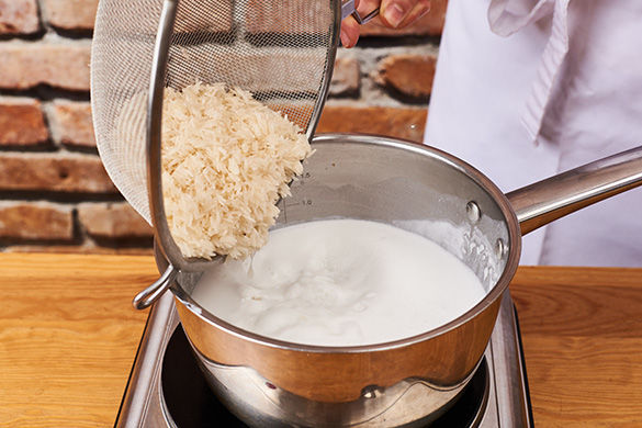 Die Kokosmilch mit 250ml Wasser in einem mittleren Topf vermengen und einmal aufkochen lassen, mit etwas Salz abschmecken.