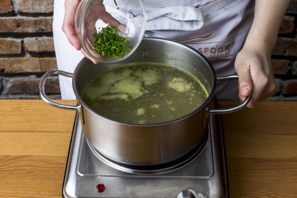 Die Petersilie von den Stängeln zupfen, die Blätter und die Stängel getrennt fein schneiden. Nun die Stängel mit den Brühwürfeln in einen mittleren Topf geben und mit 1200ml Wasser auffüllen, kurz aufkochen lassen.