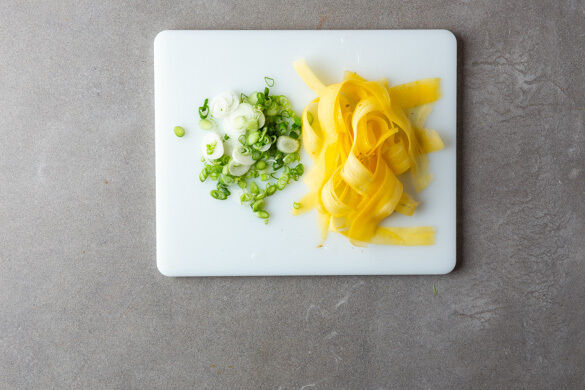 Die Kaiserschoten in das kochende Wasser geben und 2–3Min. kochen. In ein Sieb abgießen und mit kaltem Wasser abschrecken. Die Karotte schälen und mit dem Sparschäler in lange Streifen schneiden. Die Lauchzwiebel in feine Ringe schneiden.