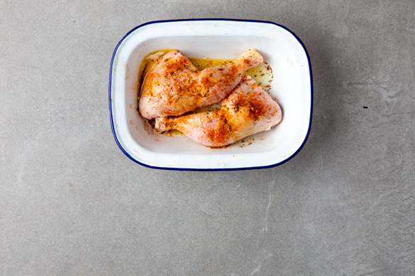 Den Backofen auf 240°C (220°C Umluft) vorheizen. Die Hähnchenschenkel trocken tupfen, dann mit der Gewürzmischung und 2EL Olivenöl einreiben.