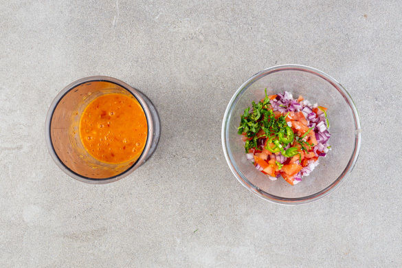 Die Tomaten vierteln. Das Kerngehäuse rausschneiden, in ein hohes Gefäß geben und mit der Sweet-Chili-Sauce und 1EL Olivenöl pürieren. Den Koriander samt Stängeln fein schneiden. Das Tomatenfruchtfleisch in kleine Würfel schneiden und mit der 1/2 der Zwiebeln und ca. 2/3 des Korianders unter das Püree mengen. Mit Salz und Chili nach Geschmack würzen.