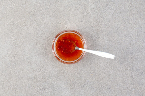 Die Sweet-Chili-Sauce mit 1EL Essig und 1EL Wasser verrühren. Die Garnelen auf dem Bohnen-Orangen-Salat anrichten und mit dem Sweet-Chili-Dip servieren.