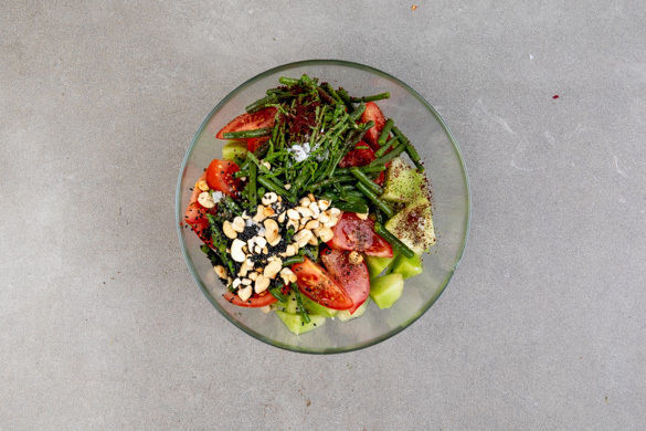 Wenn die Temperaturen steigen, darf das Abendessen gerne mal leichter ausfallen. Prima, wenn du dann alles für einen so köstlichen Salat wie diesen zur Hand hast: saftige Melone, knackige grüne Bohnen, frische Kräuter, Limette und Tomaten. Das Dressing aus gelber Paprikaschote wird mit Misopaste und geröstetem Sesamöl verfeinert. Guten Appetit!