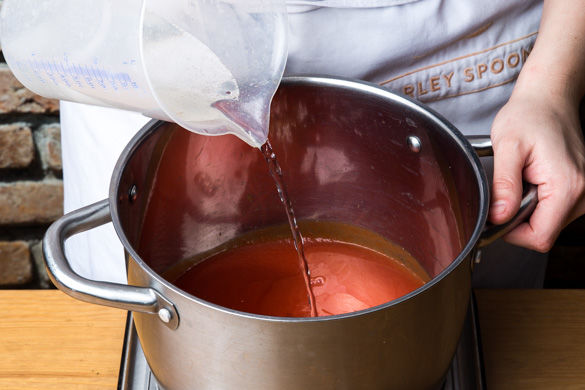 In einem großen Topf die passierten Tomaten mit 300ml leicht gesalzenem Wasser aufkochen lassen.