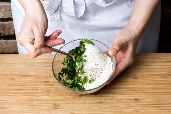 Die Blätter der Minze und des Basilikums von den Stängeln streifen und fein hacken. Die gehackten Kräuter mit 1-2TL Zitronenabrieb nach Geschmack und Knoblauch mit Rahmjoghurt mischen und mit Salz und Pfeffer abschmecken.