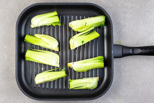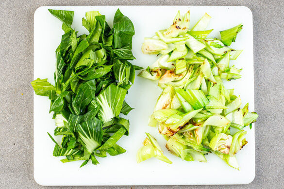 Den weißen Teil des Pak Choi auf dem Grill oder in einer Grillpfanne bei starker Hitze 4–5Min. rösten, bis sich Grillspuren abzeichnen, dabei gelegentlich wenden. In einer Schüssel beiseitestellen. Die Schüssel möglichst luftdicht mit einem Deckel oder Aluminiumfolie verschließen und den Pak Choi bis zum Servieren dämpfen lassen.