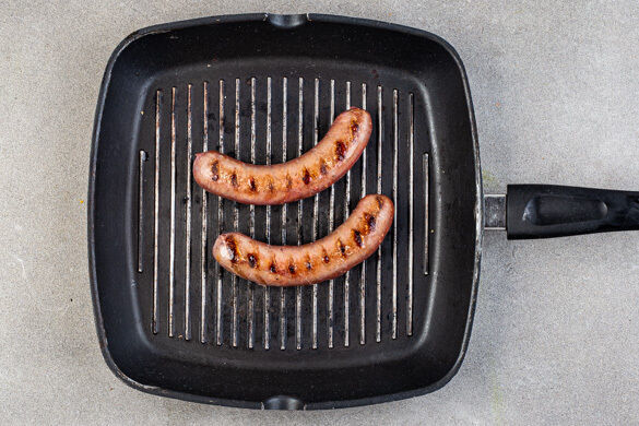 Wer einen Grill benutzt, grillt die Würste, bis sie gar sind, schneidet sie dann in ca. 3cm breite Stücke und vermengt sie mit der 1/2 der Sauce. Wer eine Grillpfanne verwendet, nimmt die Würste nach 6–8Min. aus der Pfanne, schneidet sie in ca. 3cm breite Stücke, gart sie dann für weitere 2–3Min. und vermengt sie anschließend mit der 1/2 der Sauce.