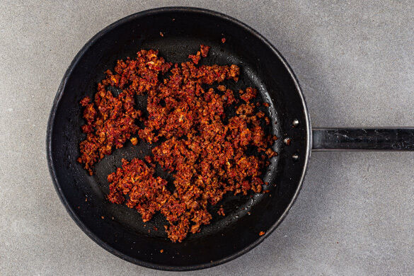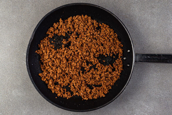 In einem mittelgroßen Topf ausreichend gesalzenes Wasser für die 1/2 der Nudeln zum Kochen bringen. Das vegane Hackfleisch in einer großen Pfanne oder einem Wok mit 1EL Pflanzenöl und je 1 kräftigen Prise Salz und Pfeffer zerkrümeln und dann ohne Rühren bei mittlerer bis starker Hitze ca. 5Min. anbraten.