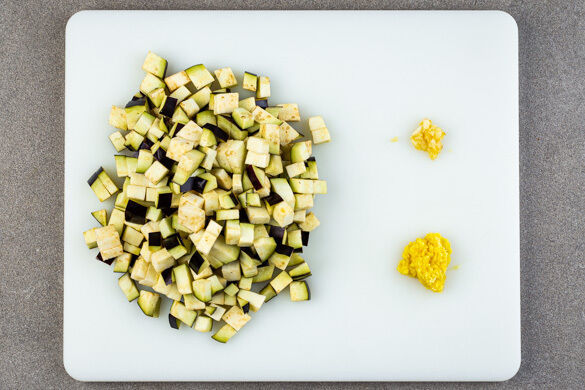 Die Aubergine in ca. 1cm große Stücke schneiden. Den Knoblauch und den Ingwer schälen und fein reiben.