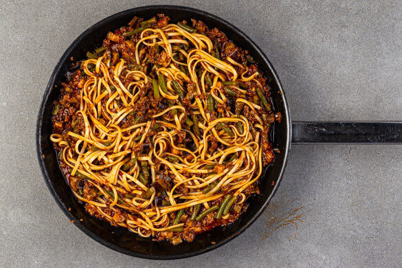 Unsere japanischen Udon-Nudeln glänzen heute mit veganem Hackfleisch auf deinem Teller: Schön kross angebraten geht es mit Ingwer, samtiger Aubergine und grünen Bohnen eine Liaison ein, die du dir nicht entgehen lassen solltest. Dem Charme dieses süßlich-würzigen, aber auch pikanten Nudelgerichts kann wirklich keiner widerstehen!