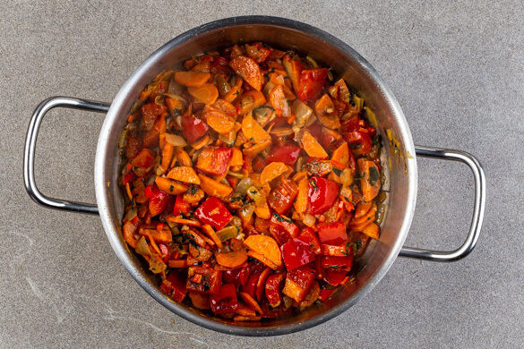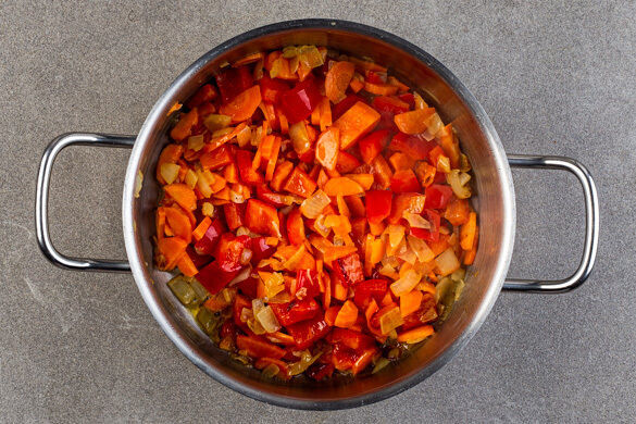Die Karotte ggf. schälen, längs halbieren und quer in dünne Scheiben schneiden. Die Paprika vierteln, entkernen und in 1–2cm große Stücke schneiden. Die Karotten und die Paprika in den Topf zu den Zwiebeln geben und 5–6Min. mitbraten.