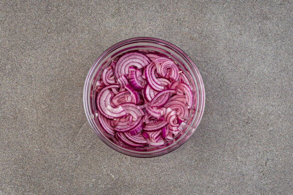 Die Zwiebel schälen, halbieren und in feine Streifen schneiden. 2EL Essig mit 2EL Wasser, 1/2TL Zucker und 1 Prise Salz verrühren, bis sich der Zucker und das Salz aufgelöst haben. Mit den Zwiebeln vermengen und beiseitestellen.