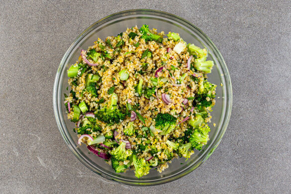 In einem mittelgroßen Topf 1L Wasser mit 1/2TL Salz zum Kochen bringen. Den Brokkoli in ca. 2cm große Röschen schneiden, den Strunk ggf. schälen und in 1–2cm kleine Würfel schneiden. Den Bulgur in das kochende Wasser geben und ca. 10Min. kochen. In den letzten 3–4Min. den Brokkoli dazugeben und mitgaren. In einem feinmaschigen Sieb abtropfen und abkühlen lassen.
