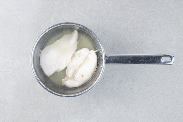 In einem mittelgroßen Topf ausreichend gesalzenes Wasser für die Nudeln zum Kochen bringen. Die Nudeln in das kochende Wasser geben und gut umrühren. Den Topf vom Herd nehmen und die Nudeln ohne Hitzezufuhr ca. 8Min. ziehen lassen. In ein Sieb abgießen und kalt abschrecken.