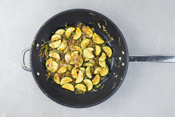 Den Lauch und die Zucchini in einer großen Pfanne mit 1EL Pflanzenöl und 1 Prise Salz bei starker Hitze ca. 4Min. anbraten. Die Sriracha-Sauce mit der Sojasauce, dem Knoblauch und 1/2TL Zucker verrühren, mit dem Gemüse in der Pfanne vermengen und das Gemüse noch 1–2Min. weitergaren.