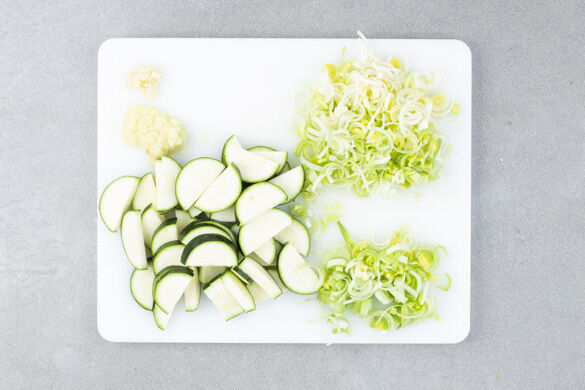 In einem kleinen Topf 250ml gesalzenes Wasser zum Kochen bringen. Den Ingwer und den Knoblauch schälen und sehr fein würfeln oder reiben. Die Zucchini längs halbieren und in ca. 1cm dicke Scheiben schneiden. Den Lauch längs halbieren und in dünne Streifen schneiden, 1 Handvoll Lauch für die Sauce getrennt beiseitelegen.