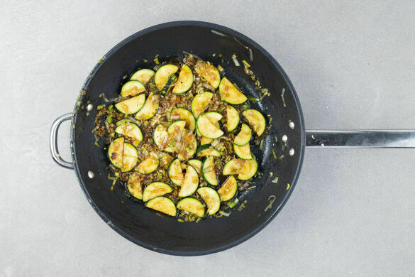 Den Lauch und die Zucchini in einer großen Pfanne mit 1EL Pflanzenöl und 1 kräftigen Prise Salz bei starker Hitze ca. 4Min. anbraten. Die Sriracha-Sauce mit der Sojasauce, dem Knoblauch und 1/2TL Zucker verrühren, mit dem Gemüse in der Pfanne vermengen und das Gemüse noch 1–2Min. weitergaren.