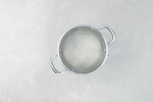 In einem mittelgroßen Topf ausreichend gesalzenes Wasser für die Nudeln zum Kochen bringen. Die Nudeln in das kochende Wasser geben und gut umrühren. Den Topf vom Herd nehmen und die Nudeln ohne Hitzezufuhr ca. 8Min. ziehen lassen. In ein Sieb abgießen und kalt abschrecken.