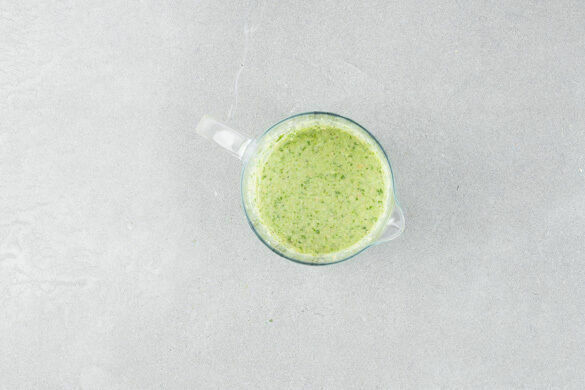 Den Koriander samt Stängeln grob schneiden und mit dem Lauch für die Sauce, dem restlichen Ingwer, der 1/2 der Erdnüsse, 2EL Pflanzenöl, 2EL Essig, 80ml Wasser und 1/2TL Salz in einem hohen Gefäß mit einem Stabmixer glatt pürieren.