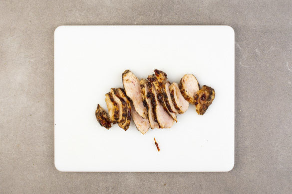 Das Fleisch in dünne Tranchen schneiden. Den Romanasalat mit der Quinoa, den Pfirsichscheiben und dem Dressing vermengen und mit Salz, Pfeffer und ggf. etwas Olivenöl würzen. Tipp: Wer mag, kann auch den Bratensaft unterrühren. Den Salat mit dem Fleisch anrichten und mit der Minze, dem Feta und den Mandelblättchen garniert servieren.