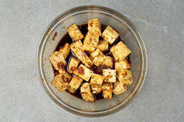 Den Tofu trocken tupfen und in ca. 2cm große Würfel schneiden. Die Sojasauce mit 2–3EL Limettensaft, der 1/2 des Knoblauchs, der 1/2 des Ingwers und 2TL (braunem) Zucker zu einer Würzsauce verrühren und mit dem Tofu vermengen.