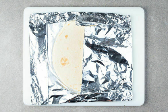 Die Tortillas aufeinanderstapeln, in Alufolie einwickeln und 3–4Min. im Ofen erwärmen.