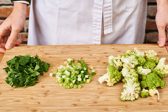 In einem großen Topf ausreichend leicht gesalzenes Wasser für die Nudeln zum Kochen bringen. Den Romanesco in mundgerechte Röschen zerteilen. Die Lauchzwiebeln in feine Ringe schneiden. Den Koriander ohne die harten Stängel grob hacken.
